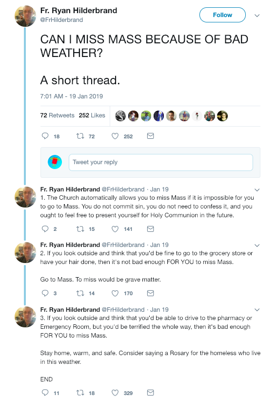 Fr. Ryan Hilderbrand, pastor of St. Mary’s Catholic Church in Huntingburg, Indiana, tweeted three things to think about when bad weather arises on Sundays or Holy Days of Obligation.