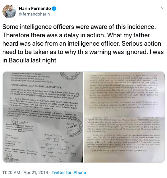 Harin Fernando, Sri Lanka’s Minister of Telecommunication, Digital Infrastructure facilities, Foreign Employment and Sports, tweeted that “some intelligence officers were aware of this incidence. Therefore there was a delay in action.”
