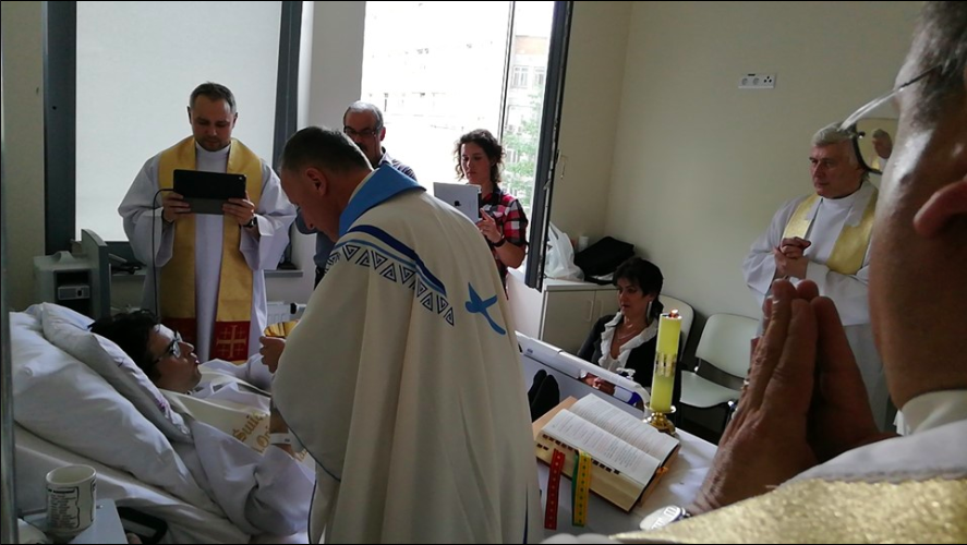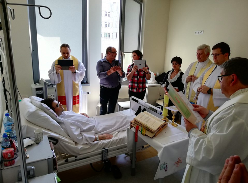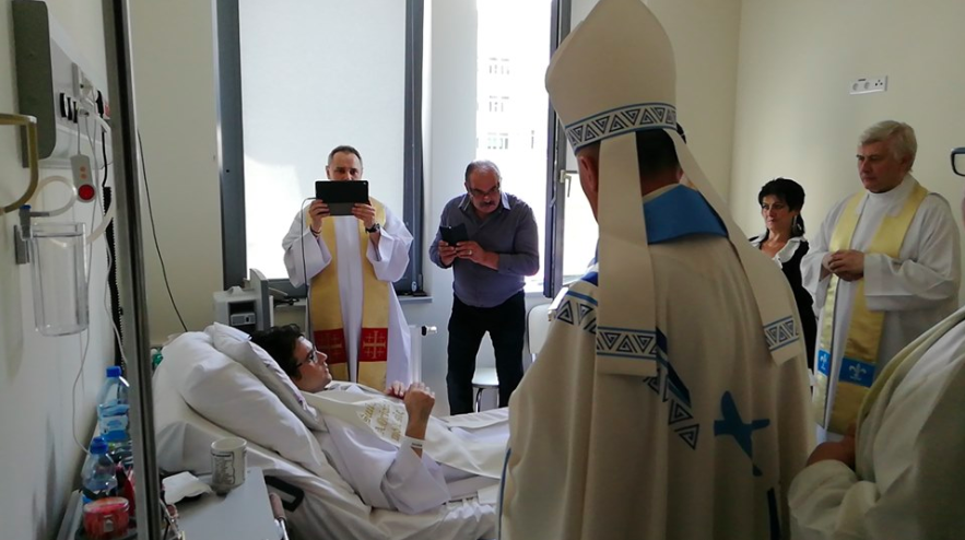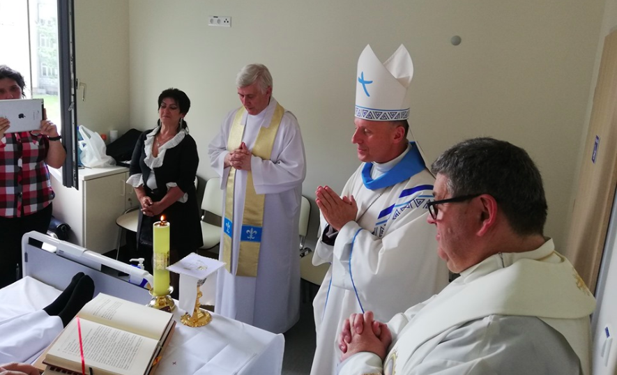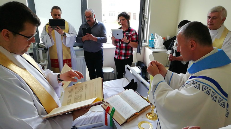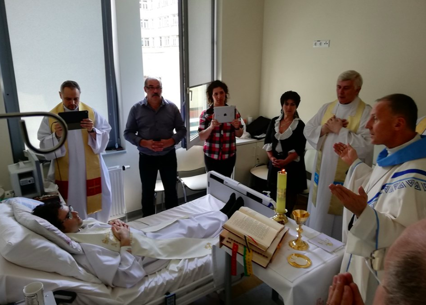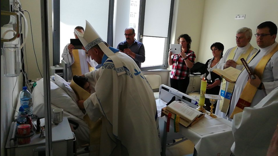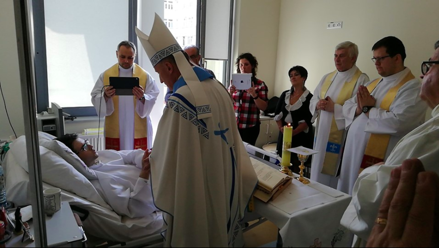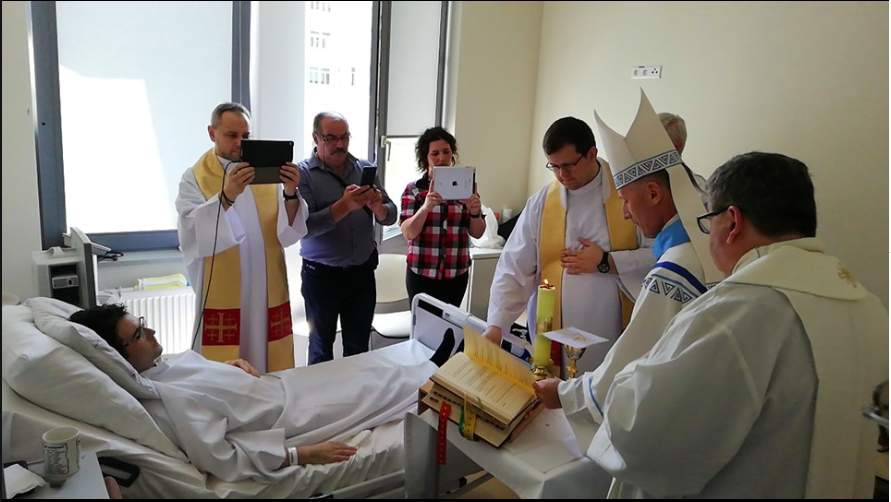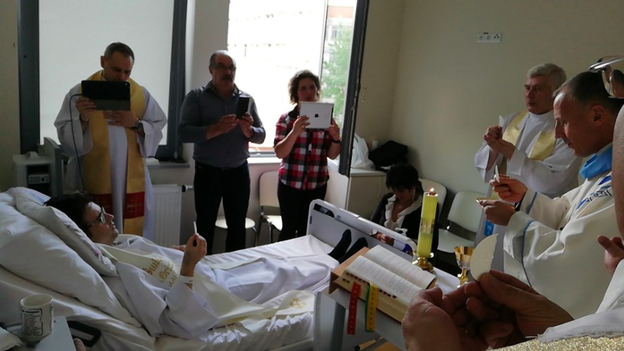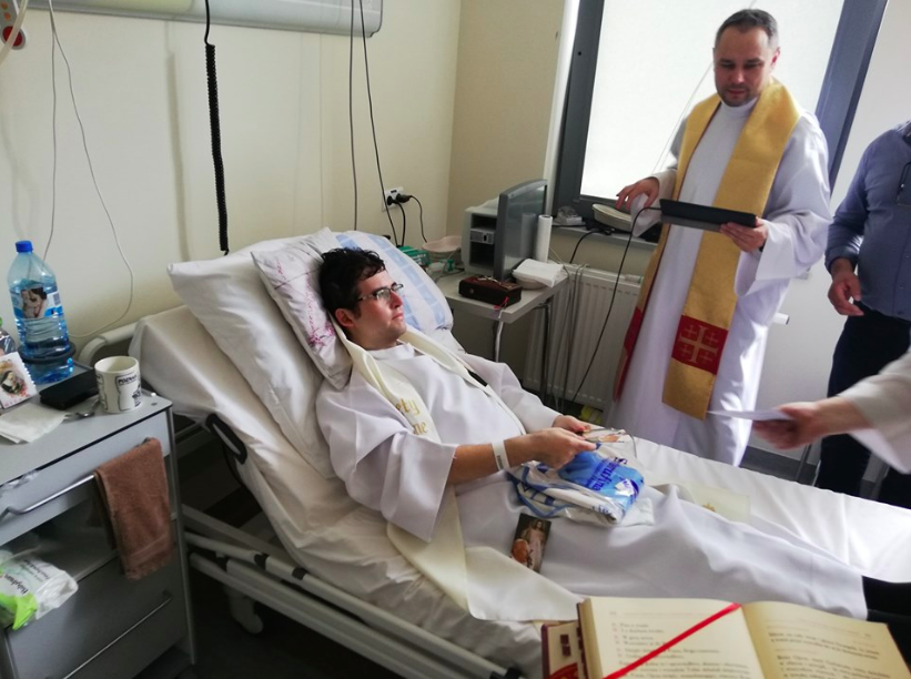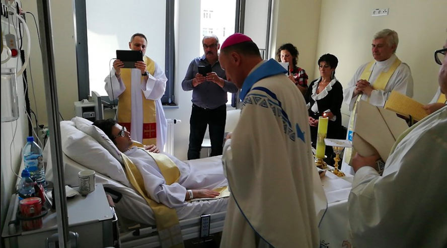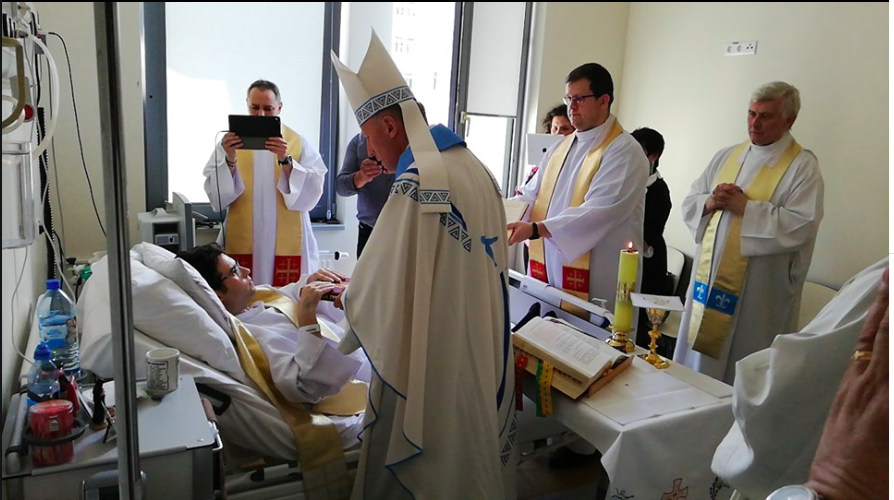 Thanks to Pope Francis’ prior approval, the Auxiliary bishop ordained the now-Fr. Michał in his hospital bed, first to the diaconate and to then to the priesthood.