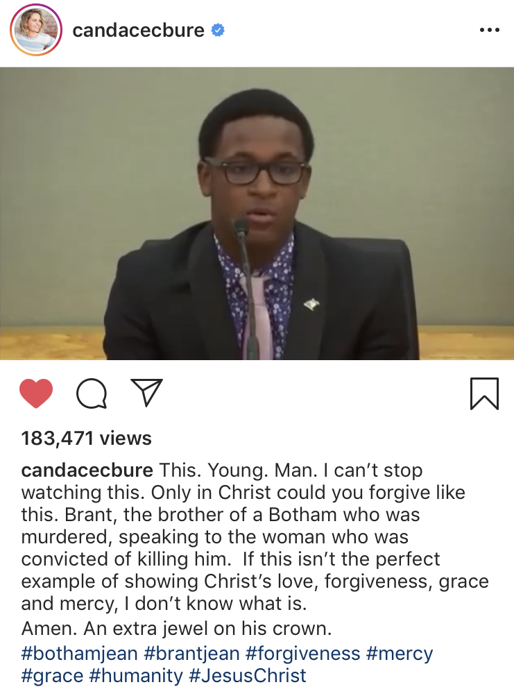 Her full post reads, “This. Young. Man. I can’t stop watching this. Only in Christ could you forgive like this. Brandt, the brother of Botham, who was murdered, speaking to the woman who was convicted of killing him. If this isn’t the perfect example of showing Christ’s love, forgiveness, grace, and mercy, I don’t know what is. Amen. An extra jewel on his crown.”