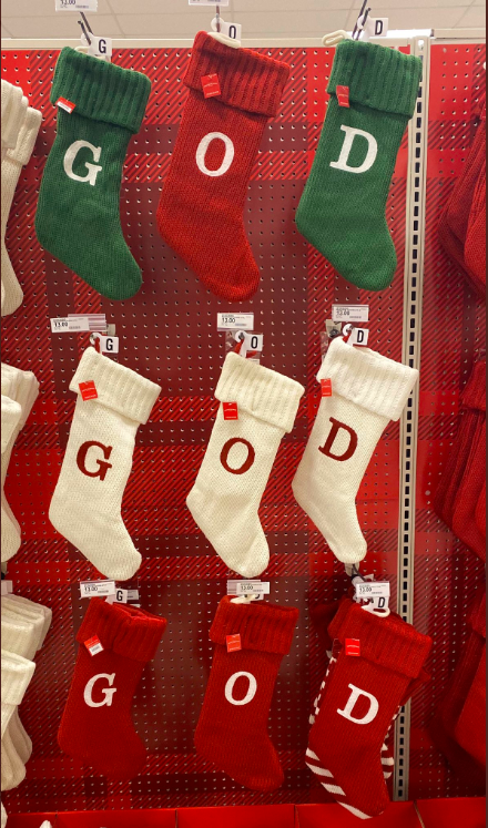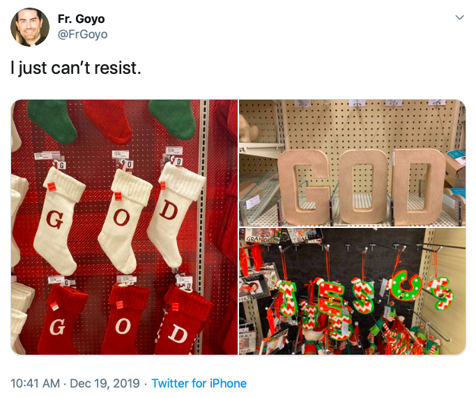 The parish priest posted multiple photos as he rearranged stockings, decorations, and other household items, spelling out religious messages. In two pictures, he spelled “God” with stockings and letters. In another photo, he spelled out “Jesus.”