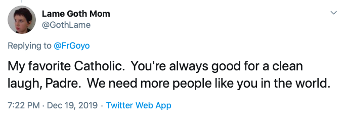 This user added, “My favorite Catholic. You’re always good for a clean laugh, Padre. We need more people like you in the world.”