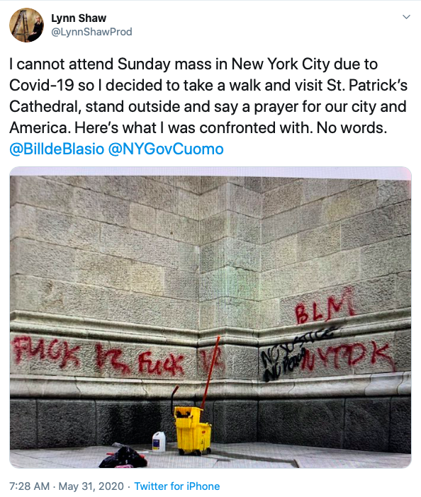 EWTN’s Raymond Arroyo also posted, “St. Patrick’s Cathedral…this is a disgrace. How does defacing a house of prayer achieve justice?”