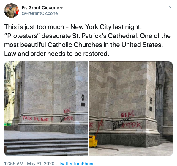 This priest wrote, “This is just too much – New York City last night: ‘Protesters’ desecrate St. Patrick’s Cathedral. One of the most beautiful Catholic Churches in the United States. Law and order needs to be restored.”
