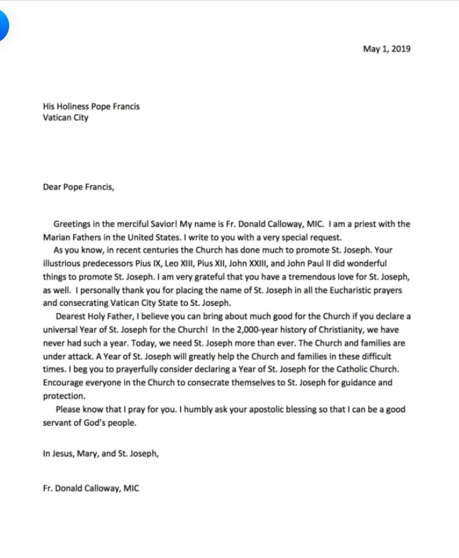 Last year (May 1, 2019), I wrote a letter to Pope Francis asking him to please consider declaring a Year of St. Joseph…