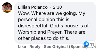 Another Facebook user said, “Wow. Where are we going. My personal opinion–this is disrespectful. God’s house is of Worship and Prayer. There are other places to do this.”