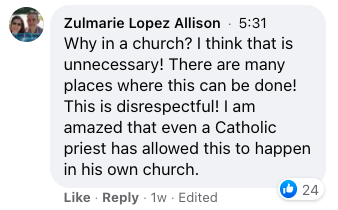 This Facebook user also said, “Why in a church? I think that is unnecessary! There are many places where this can be done! This is disrespectful! I am amazed that even a Catholic priest has allowed this to happen in his own church.”