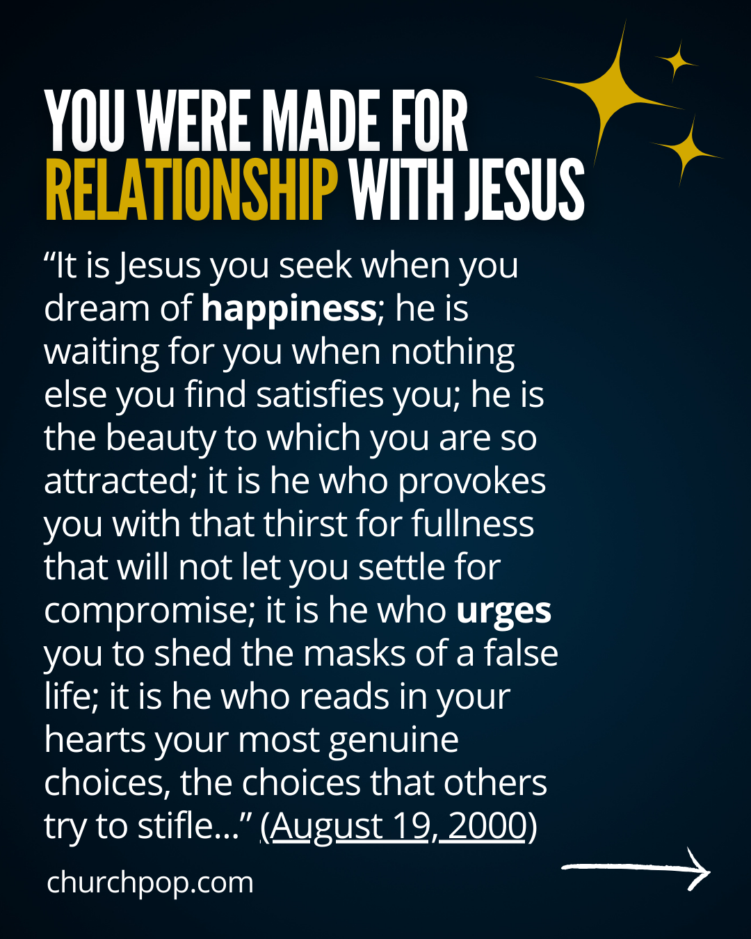 “It is Jesus you seek when you dream of happiness; he is waiting for you when nothing else you find satisfies you; he is the beauty to which you are so attracted; it is he who provokes you with that thirst for fullness that will not let you settle for compromise; it is he who urges you to shed the masks of a false life; it is he who reads in your hearts your most genuine choices, the choices that others try to stifle.