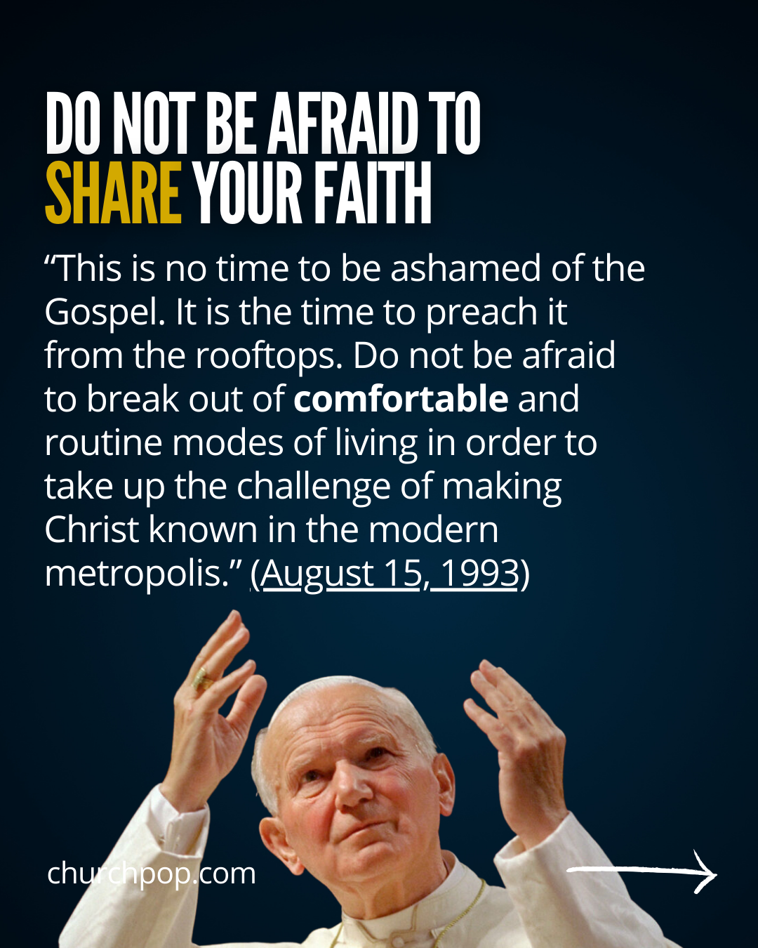 “This is no time to be ashamed of the Gospel. It is the time to preach it from the rooftops. Do not be afraid to break out of comfortable and routine modes of living in order to take up the challenge of making Christ known in the modern metropolis.” (Aug. 15, 1993)