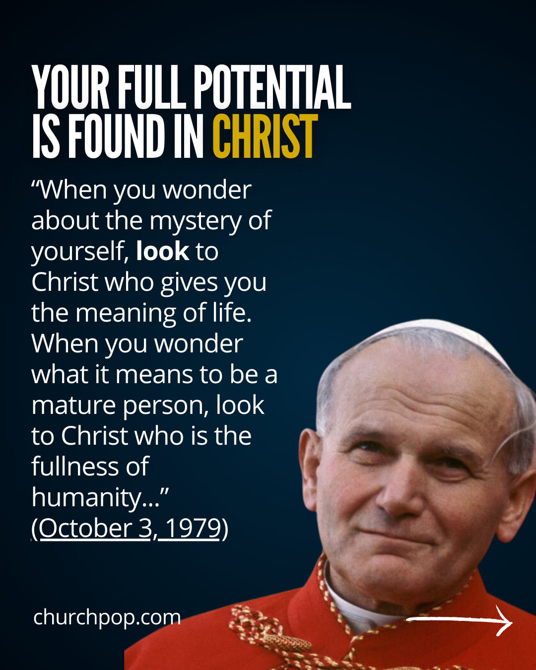 “When you wonder about the mystery of yourself, look to Christ who gives you the meaning of life. When you wonder what it means to be a mature person, look to Christ who is the fullness of humanity. And when you wonder about your role in the future of the world and of the United States, look to Christ. Only in Christ will you fulfill your potential as an American citizen and as a citizen of the world community.” (Oct. 3, 1979)