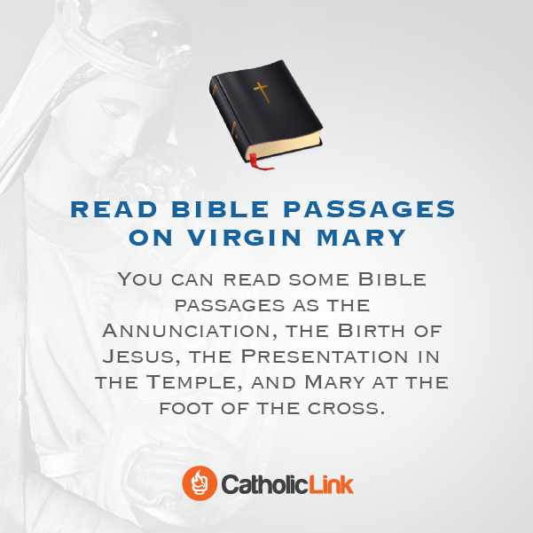 Below, the infographic suggests reading bible passages, such as as “the annunciation, the birth of Jesus, the presentation of Jesus in the temple, and Mary at the foot of the Cross.”