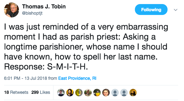 The text reads: “I was just reminded of a very embarrassing moment I had as parish priest: Asking a longtime parishioner, whose name I should have known, how to spell her last name. Response: S-M-I-T-H.”