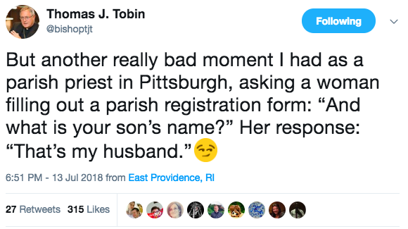 The text reads: “But another really bad moment I had as a parish priest in Pittsburgh, asking a woman filling out a parish registration form: ‘And what is your son’s name?’ Her response: ‘That’s my husband.’😏”