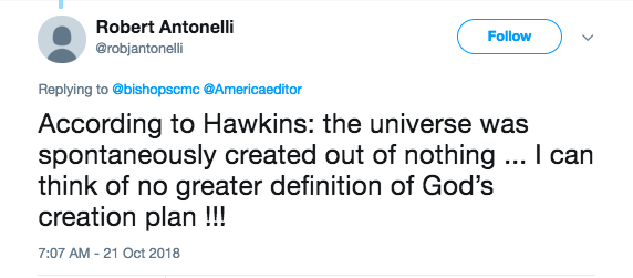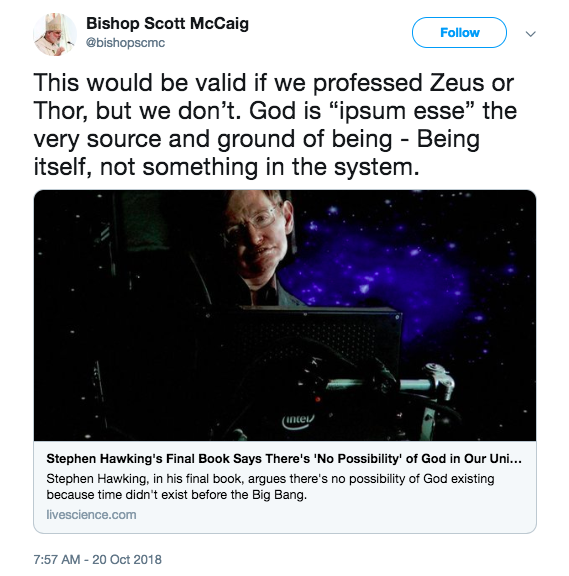 BishopMcCaig’s Twitter post reads, “This would be valid if we professed Zeus or Thor, but we don’t. God is “ipsum esse” the very source and ground of being – Being itself, not something in the system.”