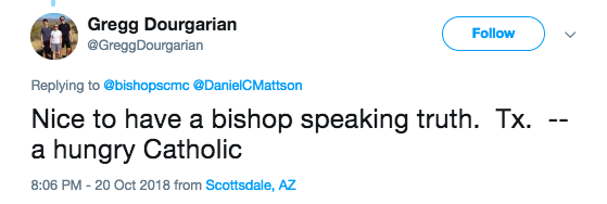 This user’s tweet reads, “Nice to have a bishop speaking the truth. Tx. — a hungry Catholic.”