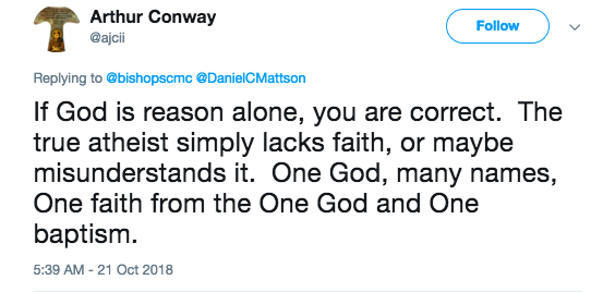 This user explained, “If God is reason alone, you are correct. The true atheist simply lacks faith, or maybe misunderstands it. One God, many names, One faith from the One God and One baptism.”