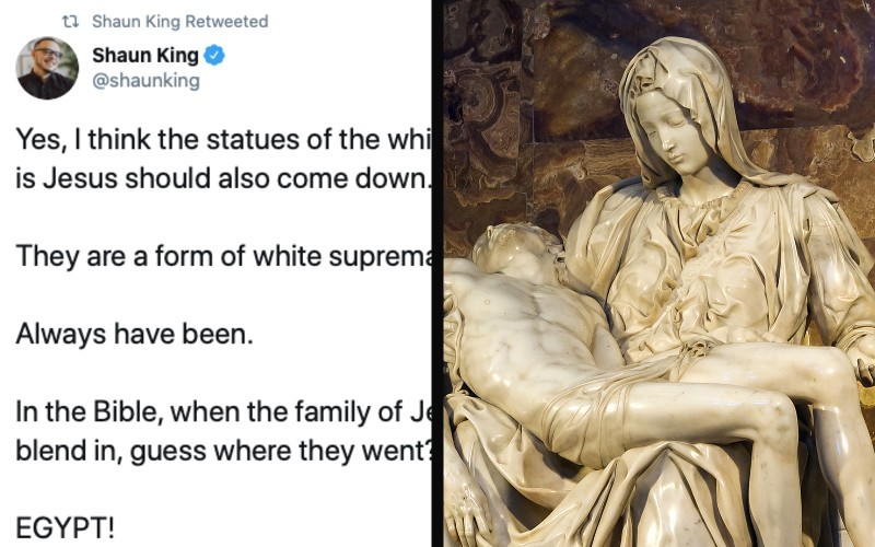 Black Lives Matter activist Shaun King calls for the destruction of all white statues of Jesus, Mary, and the saints. He said in a series of tweets to “tear them down” because they represent “white supremacy.”