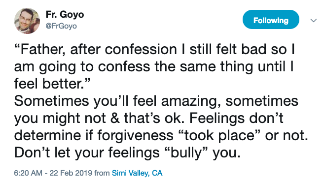 His tweet reads, “Father, after confession I still felt bad so I am going to confess the same thing until I feel better.” / Sometimes you’ll feel amazing, sometimes you might not & that’s ok. Feelings don’t determine if forgiveness ‘took place’ or not. Don’t let your feelings ‘bully” you.'”