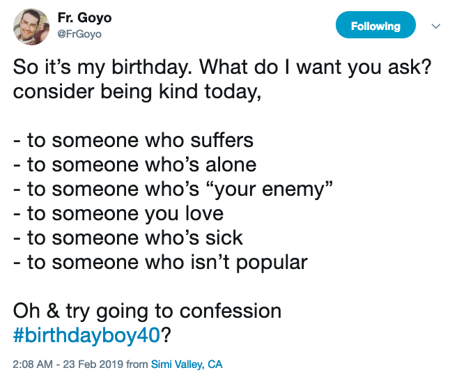 After posting the above tweet, Fr. Goyo posted another tweet asking his followers to go to confession for his birthday.