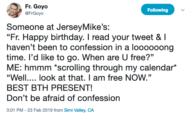 His tweet reads, “Someone at Jersey Mike’s: ‘Fr. Happy birthday. I read your tweet & I haven’t been to confession in a loooooong time. I’d like to go. When are U free?’ / ME: hmmm *scrolling through my calendar* ‘Well…. look at that. I am free NOW.’ / BEST BTH PRESENT! Don’t be afraid of confession.”