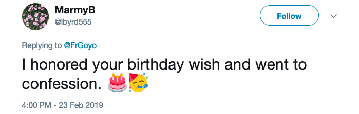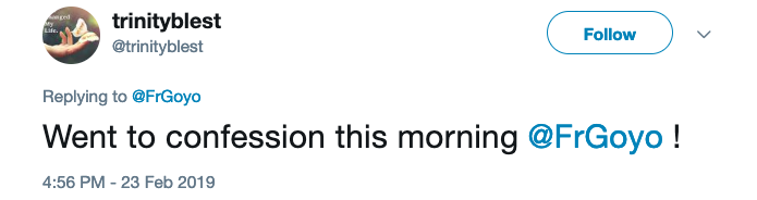This user also responded, “Went to confession this morning @FrGoyo!”
