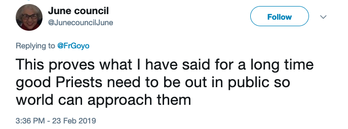 This user said, “This proves what I have said for a long time. Good priests need to be out in public so the world can approach them.”