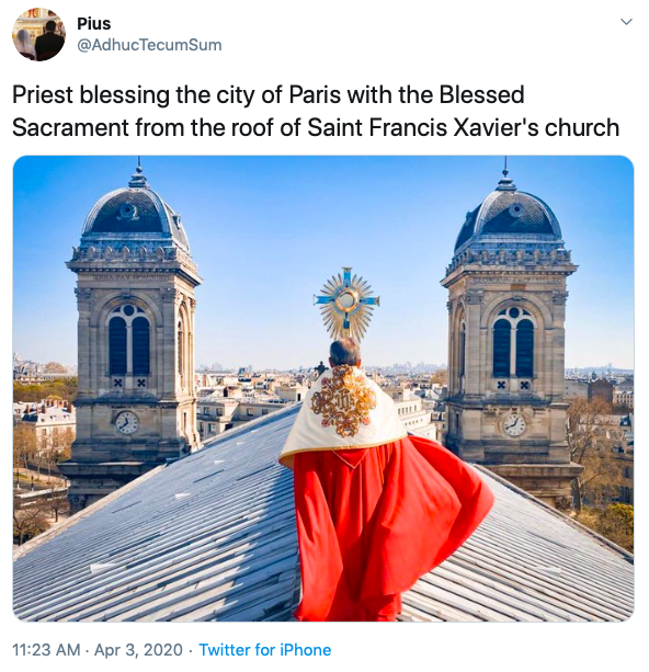The first tweet reads, “Priest blessing the city of Paris with the Blessed Sacrament from the roof of Saint Francis Xavier’s church.”