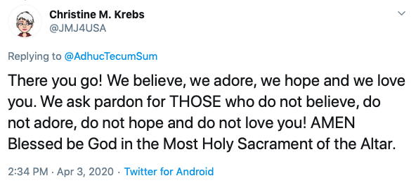 Another user said, “There you go! We believe, we adore, we hope and we love you. We ask pardon for THOSE who do not believe, do not adore, do not hope and do not love you! AMEN. Blessed be God in the Most Holy Sacrament of the Altar.”