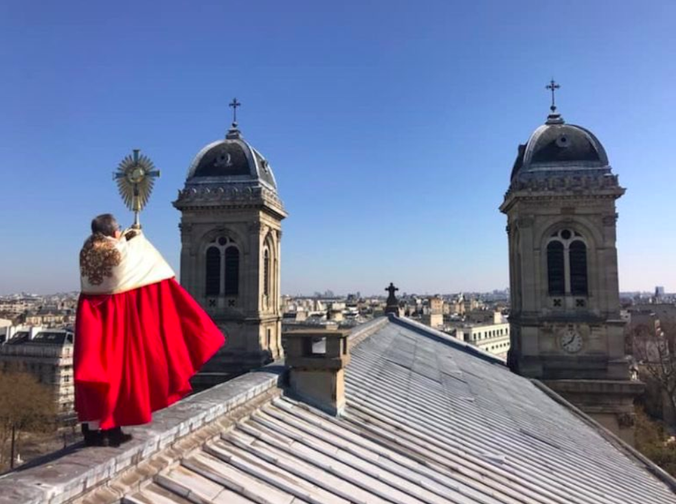 Pastor Msgr. Bruno Lefèvre-Pontalis of St. Francis Xavier Catholic Church blessed Paris with the Blessed Sacrament on his church‘s rooftop in France. This social media user posted the beautiful photos on Twitter.