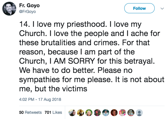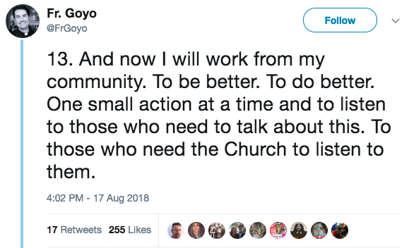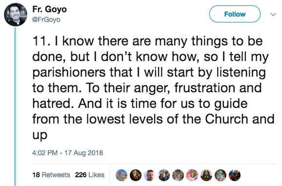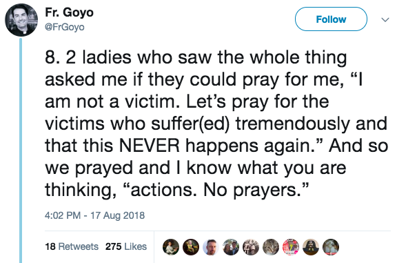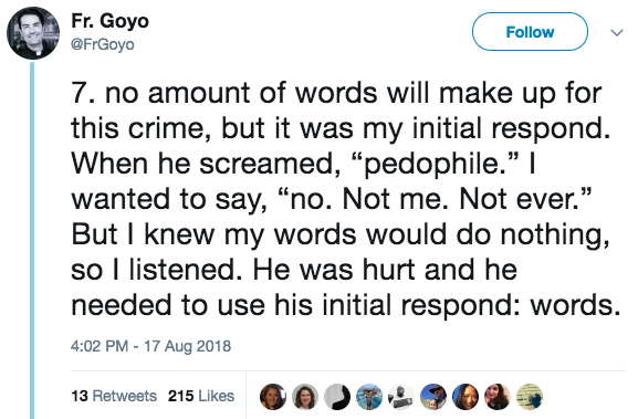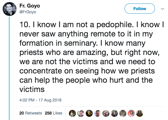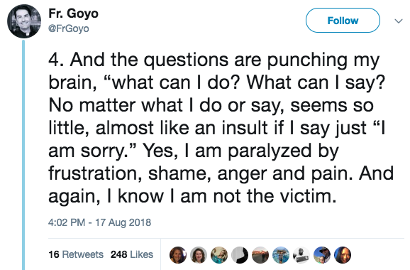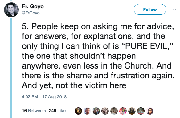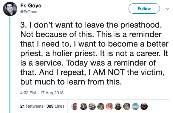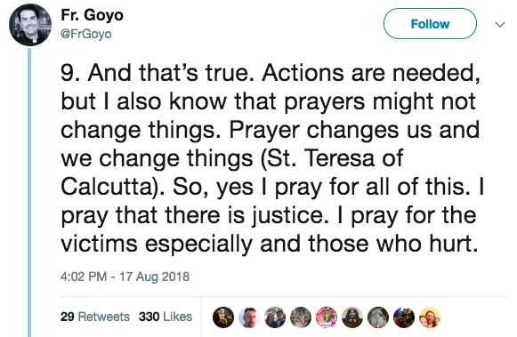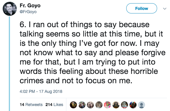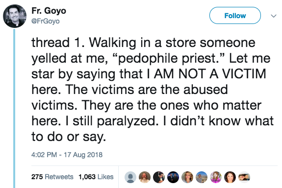 Fr. Goyo Hidalgo is a priest in the Archdiocese of Los Angeles who’s pretty active on social media. Yesterday, he posted a 14-tweet thread about how a stranger recently yelled “pedophile priest” at him at a store, and how the experience has gotten him thinking about how a priest like him should respond. It’s a powerful thread, and we’ve shared it below.