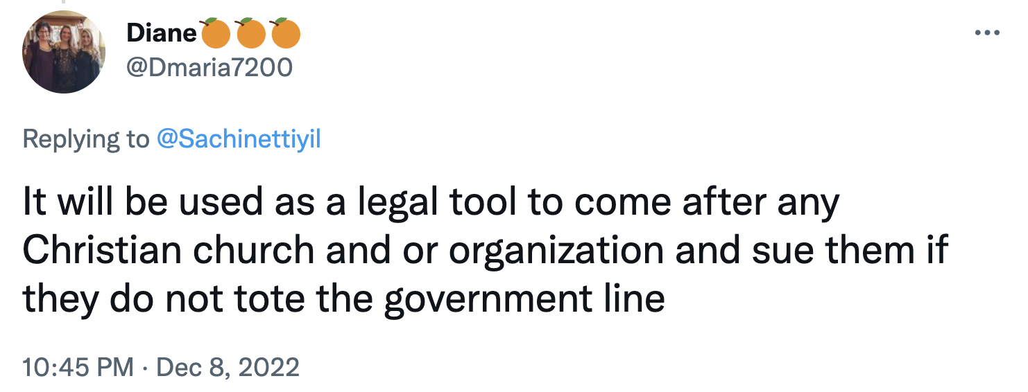This user also said, “It will be used as a legal tool to come after any Christian church and or organization and sue them if they do not tote the government line.”