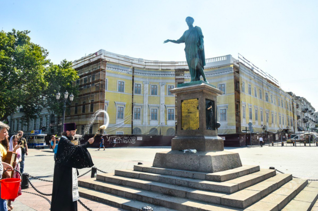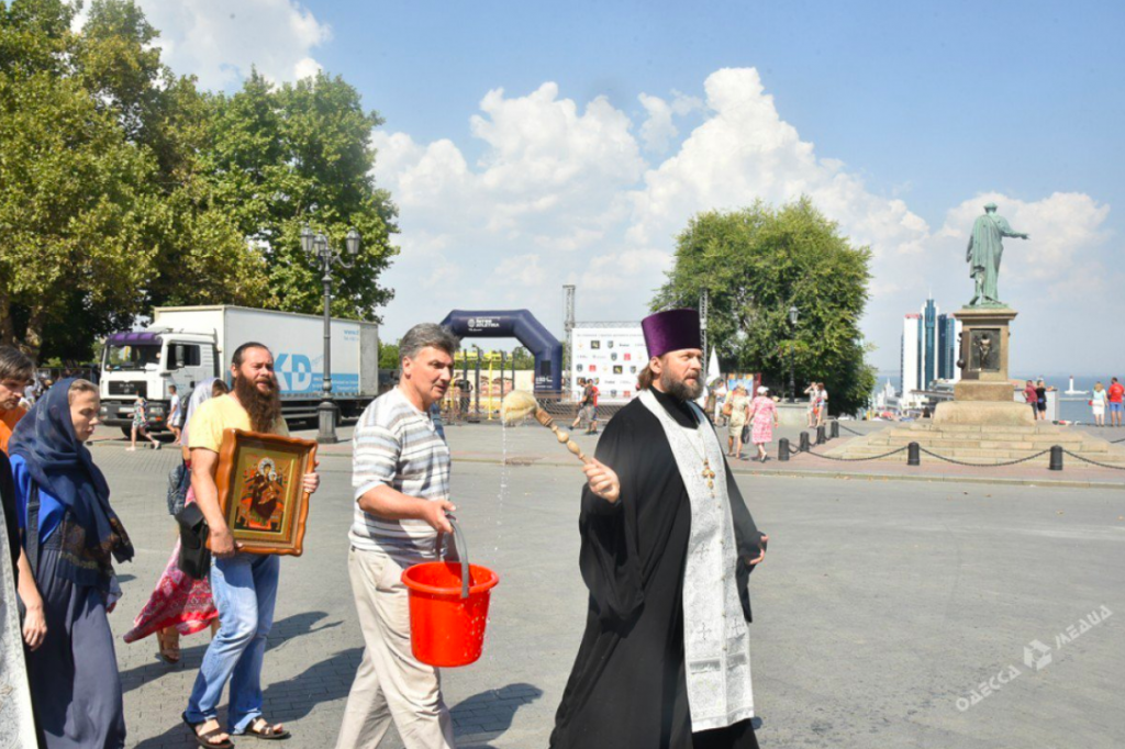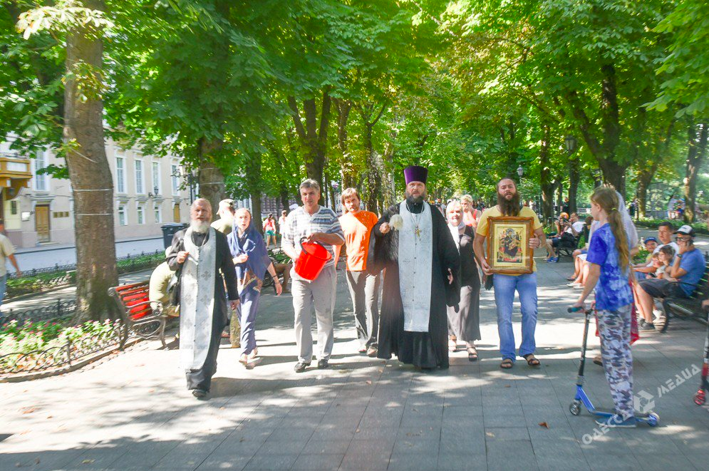 The head of the Missionary Department of the Eastern Orthodox Diocese of Odessa Fr. Oleg Mokryak led the cleansing, with help from a group of laypeople. Together, the dispensed holy water on people, the road, and on monuments as they walked, explaining to onlookers that they were specifically cleansing the area following the LGBT parade.