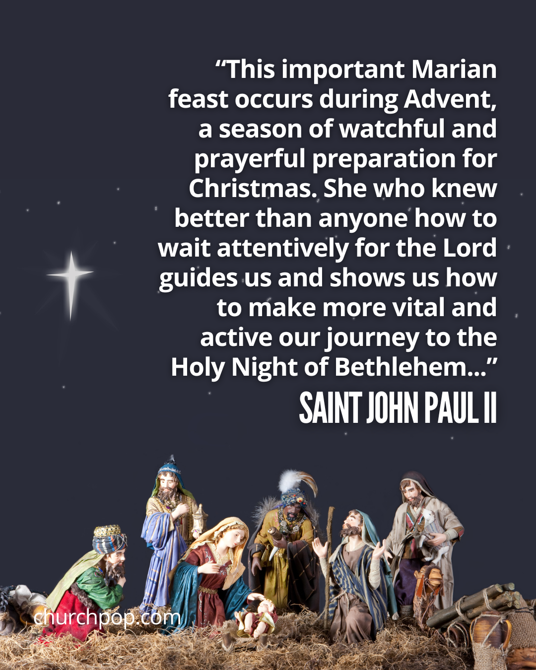 “This important Marian feast occurs during Advent, a season of watchful and prayerful preparation for Christmas. She who knew better than anyone how to wait attentively for the Lord guides us and shows us how to make more vital and active our journey to the Holy Night of Bethlehem. With her, we spend these weeks in prayer and, guided by her bright star, hasten to make the spiritual journey that will lead us to celebrate the mystery of the Incarnation with greater intensity.” - Saint John Paul II