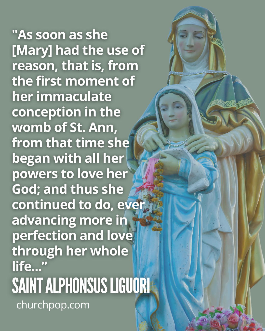 "As soon as she [Mary] had the use of reason, that is, from the first moment of her immaculate conception in the womb of Saint Ann, from that time she began with all her powers to love her God; and thus she continued to do, ever advancing more in perfection and love through her whole life. All her thoughts, her desires, her affections, were wholly given to God; not a word, not a motion, not a glance of the eye, not a breath of hers that was not for God and for his glory, never departing one step, nor separating herself for one moment from the divine love." - Saint Alphonsus Liguori