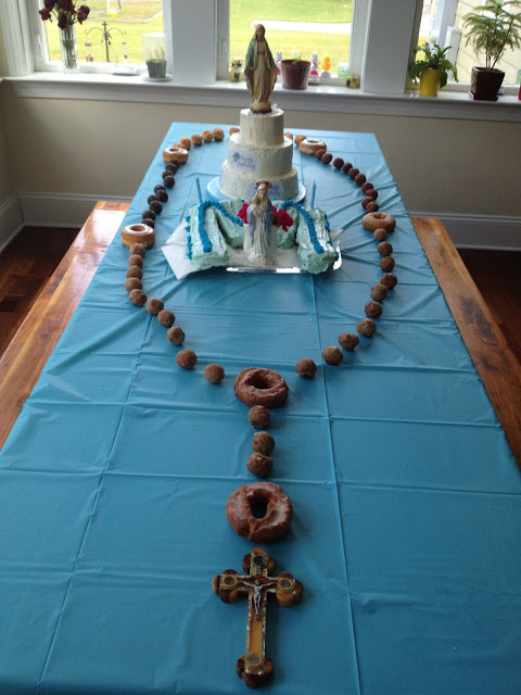 Smith said that they use glazed doughnuts for the “Our Father” beads, and doughnut holes for the “Hail Mary Beads. They also bake a cake in the shape of an “M,” which represents Mary’s name.  Here’s a close-up of the cake: