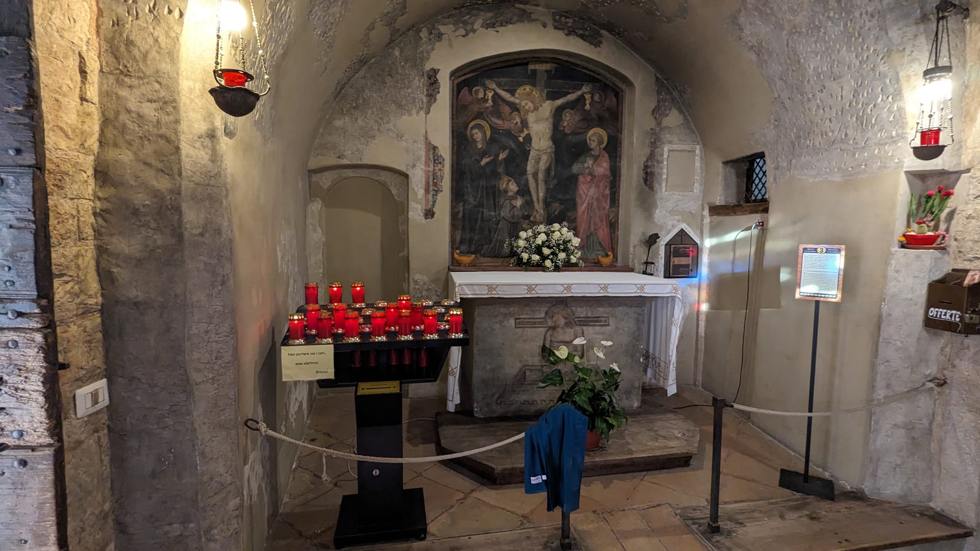 Most of the present-day hermitage was built by another Franciscan saint, San Bernardino of Siena, shortly after Saint Francis’ death. Inside the hermitage, I first visited the church of San Bernardino, a small church containing a 15th-century fresco of the crucifixion.
