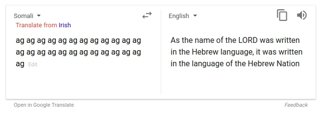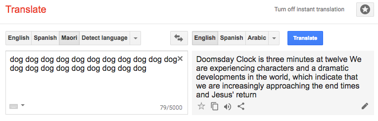 If you try to translate the word “dog” repeated 19 times from the language Maori to English, you get this bizarre result: “Doomsday Clock is three minutes at twelve We are experiencing characters and a dramatic developments in the world, which indicate that we are increasingly approaching the end times and Jesus’ return“.