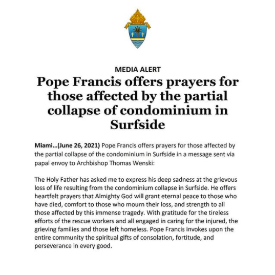 “The Holy Father has asked me to express his deep sadness at the grievous loss of life resulting from the condominium collapse in Surfside,” Pope Francis sent in a message via papal envoy to Miami Abp. Thomas Wenski.