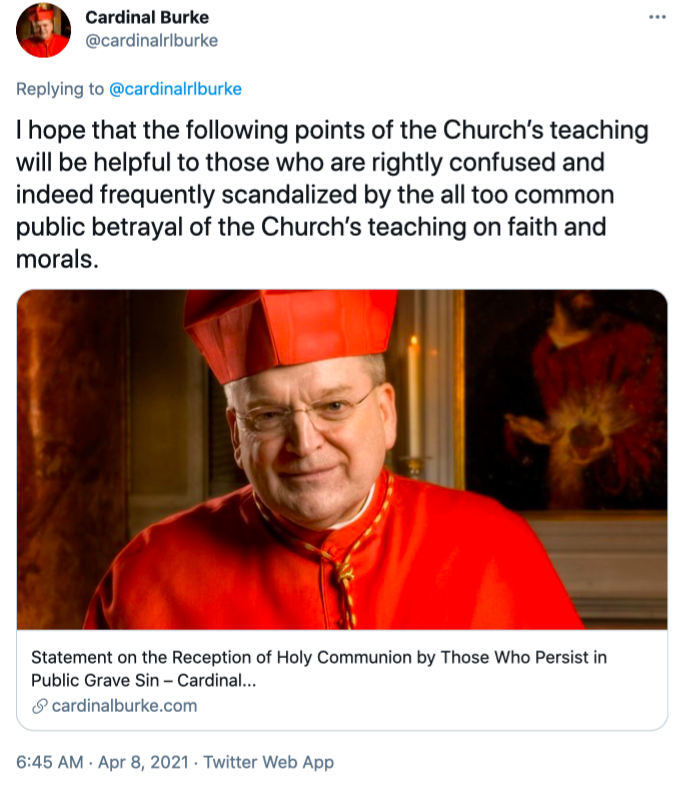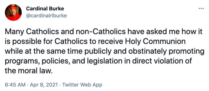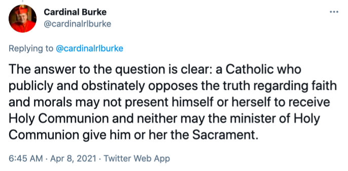 Cardinal Burke’s second tweet reads, “The answer to the question is clear: a Catholic who publicly and obstinately opposes the truth regarding faith and morals may not present himself or herself to receive Holy Communion and neither may the minister of Holy Communion give him or her the Sacrament.”