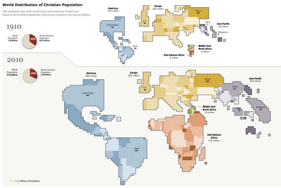 4) Here’s a weighted map of the world’s Christian population in 1910 and 2010: