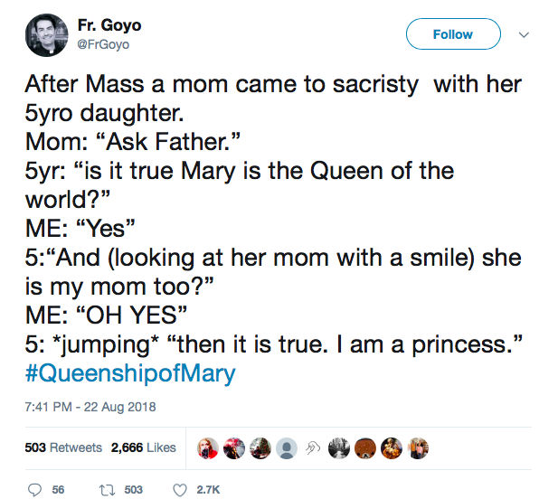 The text says, “After Mass, a mom came to the sacristy with her five-year-old daughter. / Mom: ‘Ask Father.’ / 5 year-old: ‘is it true Mary is the Queen of the world?’ / Me: ‘Yes’ / 5: ‘And (looking at her mom with a smile) she is my mom too?’ / Me: ‘OH YES’ / 5: *jumping* “then it is true. I am a princess.’ / #QueenshipofMary”