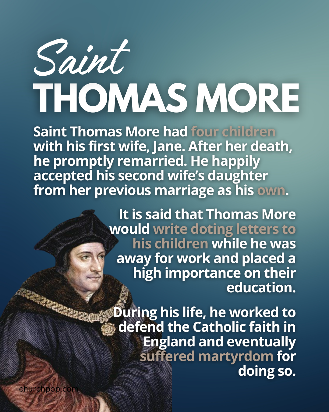 Saint Thomas More had four children with his first wife, Jane. After her death, he promptly remarried. He happily accepted his second wife’s daughter from her previous marriage as his own.