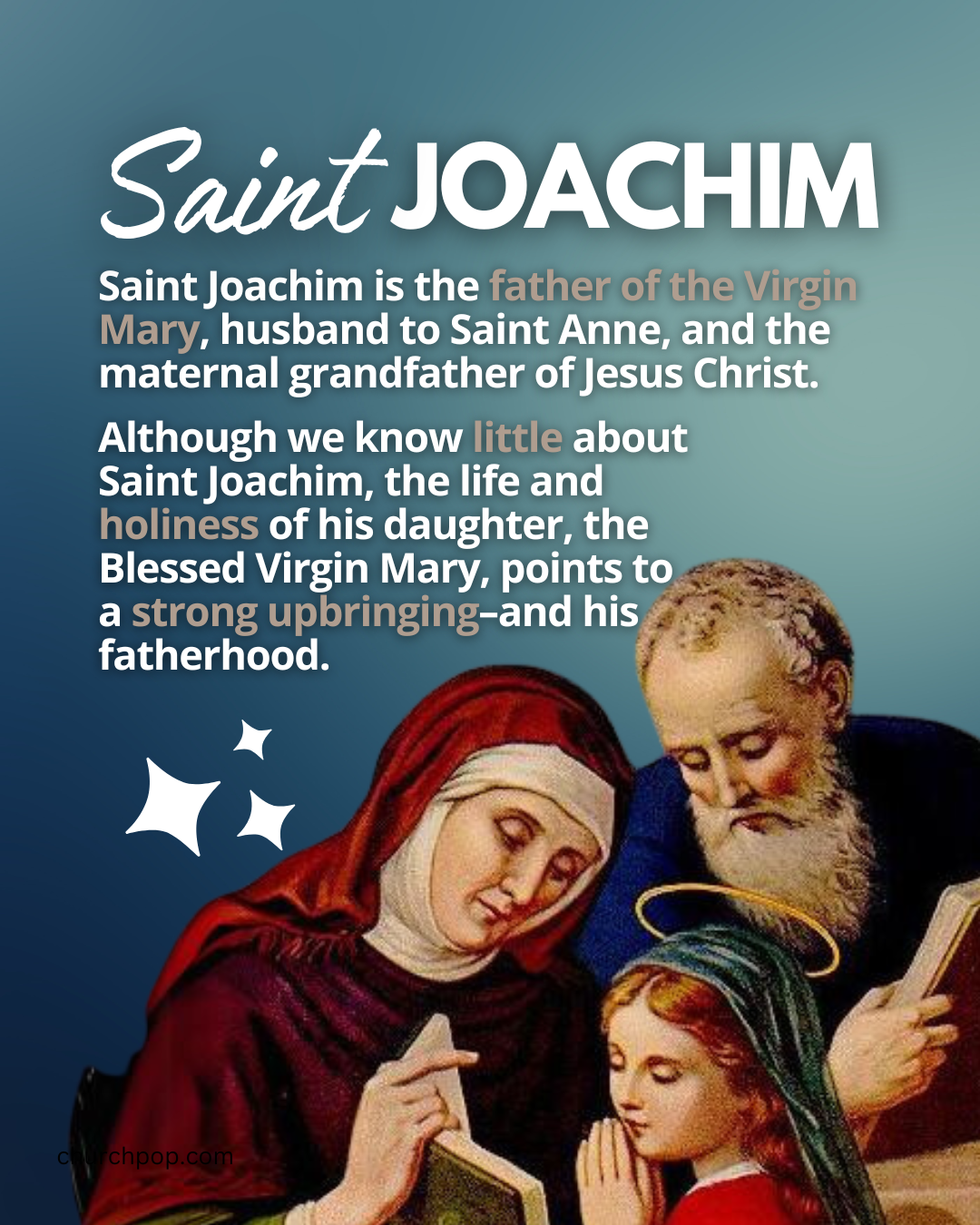Saint Joachim is the father of the Virgin Mary, husband to Saint Anne, and the maternal grandfather of Jesus Christ.