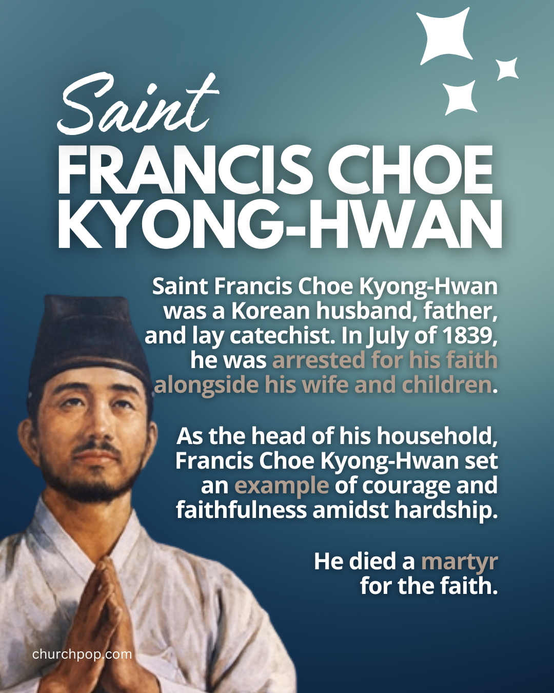 Saint Francis Choe Kyong-Hwan was a Korean husband, father, and lay catechist. In July of 1839, he was arrested for his faith alongside his wife and children.