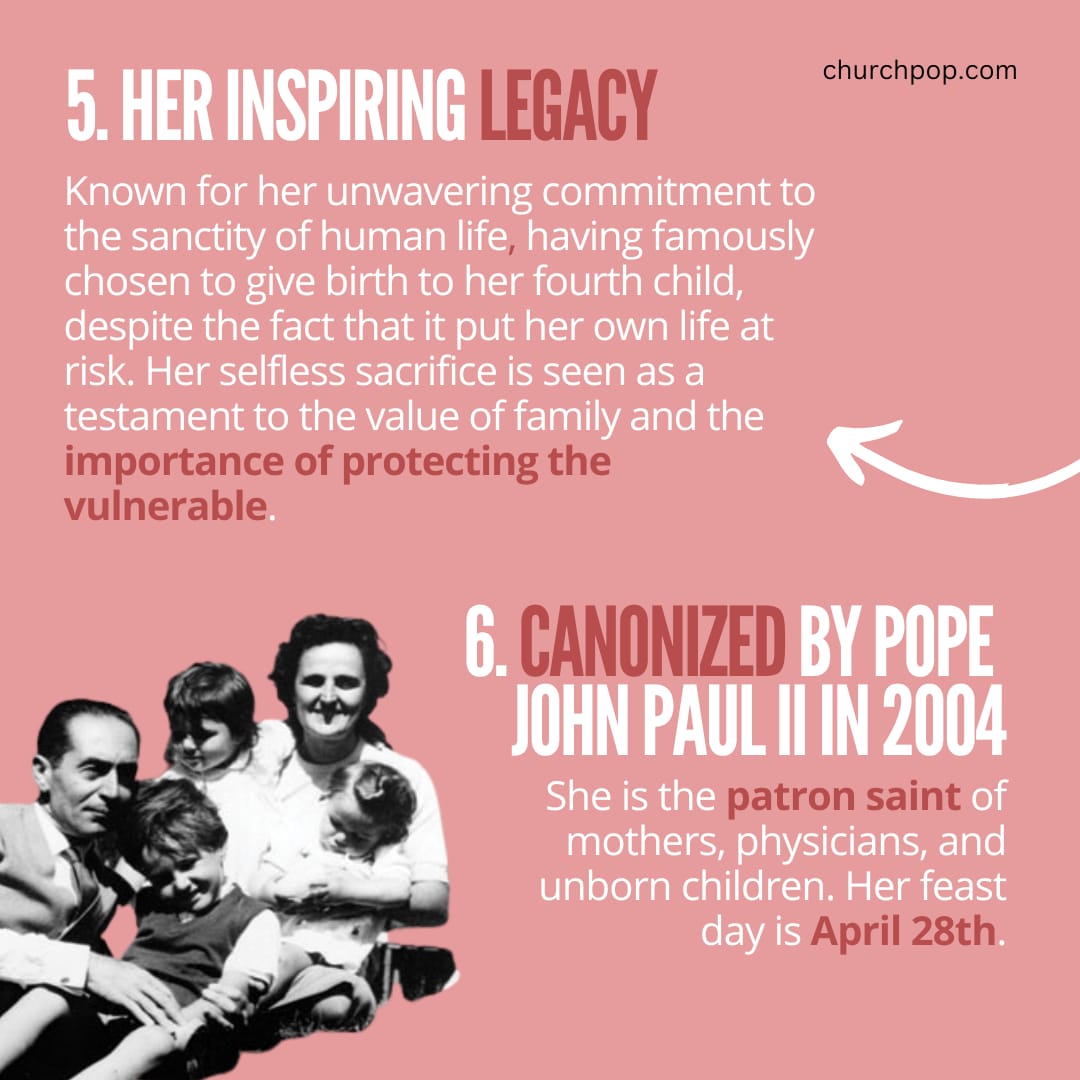 St. Gianna is known for her unwavering commitment to the sanctity of human life. She famously chosen to give birth to her fourth child, despite the fact that it put her own life at risk. Her selfless sacrifice is seen as a testament to the value of family and the importance of protecting the vulnerable.
