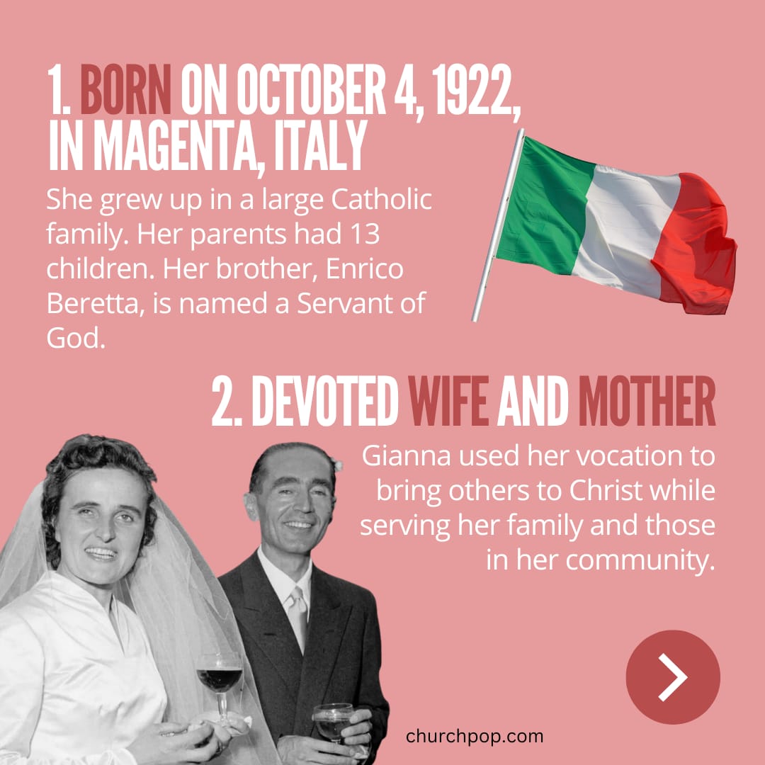 St. Gianna grew up in a large Catholic family. Her parents had 13 children, although only eight of them survived to adulthood. Her brother, Enrico Beretta, is named a Servant of God, and both parents were members of the Third Order of St. Francis.