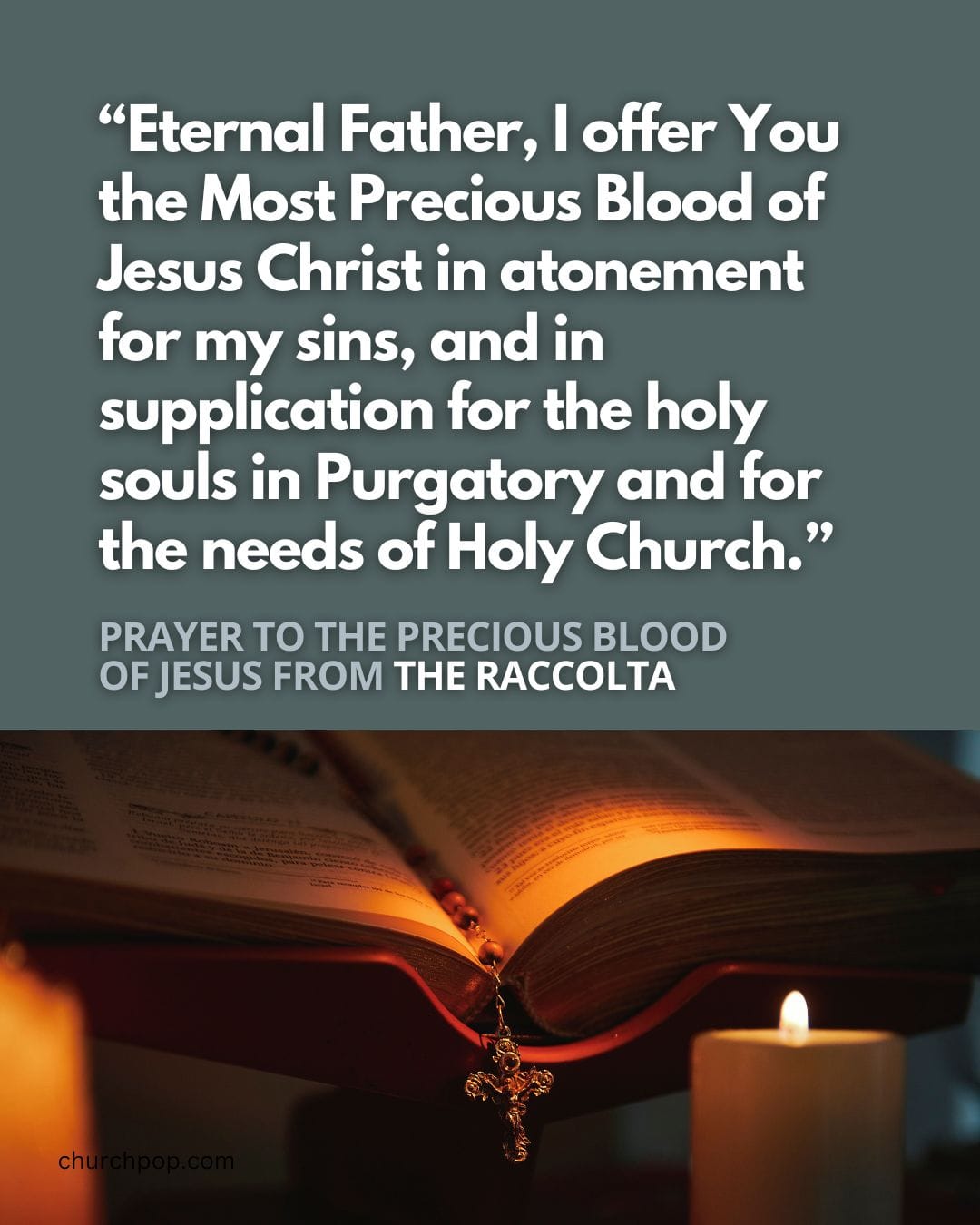 “Eternal Father, I offer You the Most Precious Blood of Jesus Christ in atonement for my sins, and in supplication for the holy souls in Purgatory and for the needs of Holy Church.”