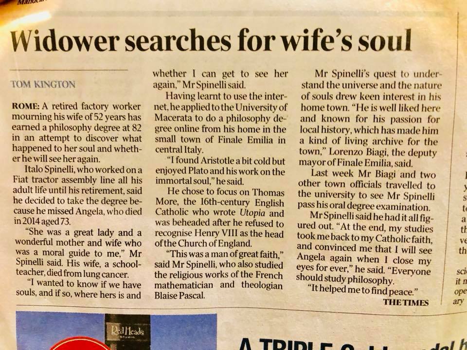 Now that he has his doctorate, the article says, “Mr. Spinelli said he had it all figured out. ‘At the end, my studies took me back to my Catholic faith, and convinced me that I will see Angela again when I close my eyes for ever.'”