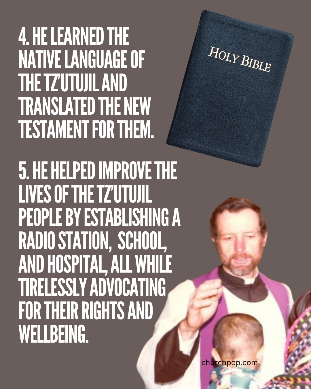 5. He helped improve the lives of the Tz’utujil people by establishing a radio station, school, and hospital, all while tirelessly advocating for their rights and well-being.