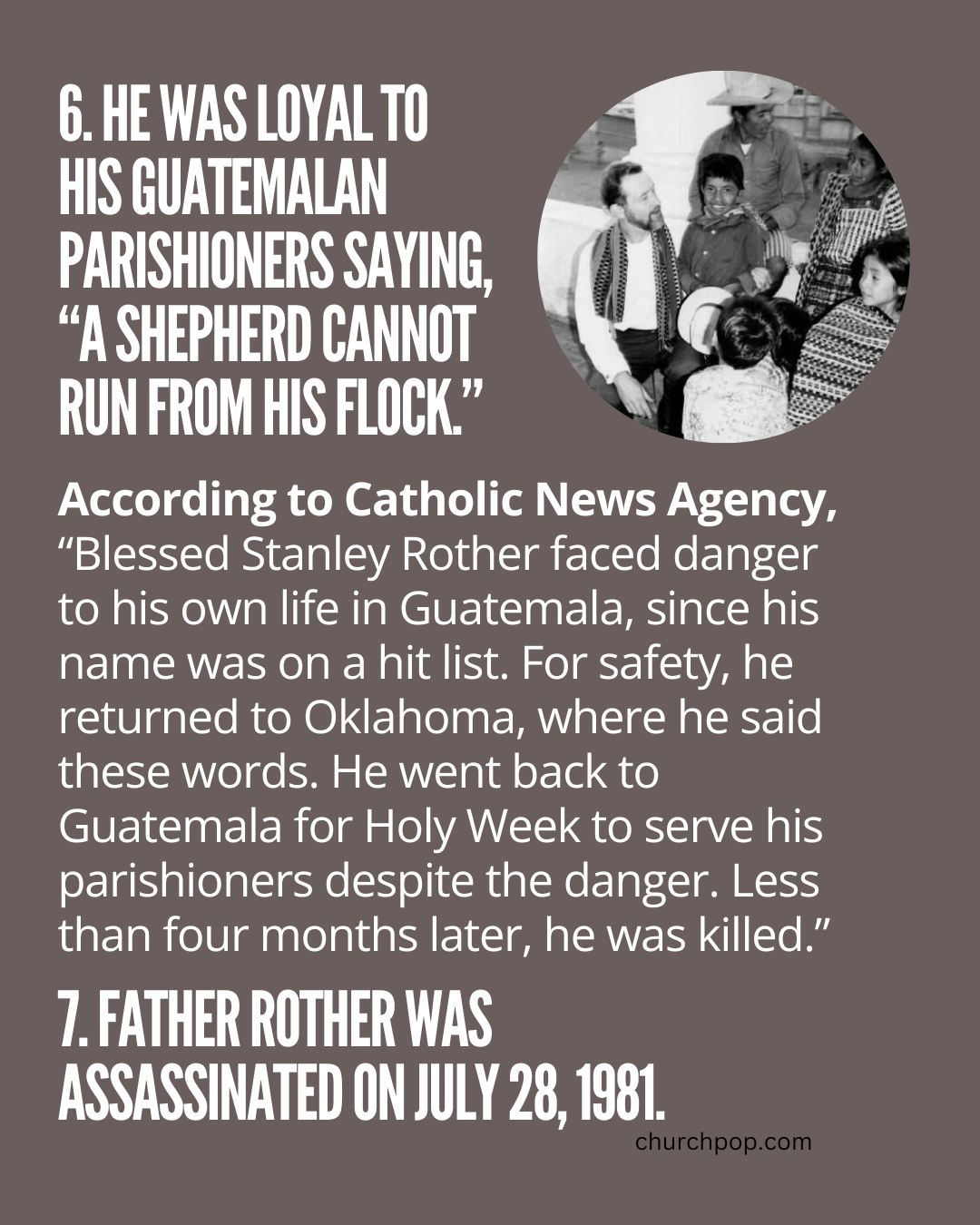 “Blessed Stanley Rother faced danger to his own life in Guatemala since his name was on a hit list. For safety, he returned to Oklahoma, where he said these words. He went back to Guatemala for Holy Week to serve his parishioners despite the danger. Less than four months later, he was killed.”